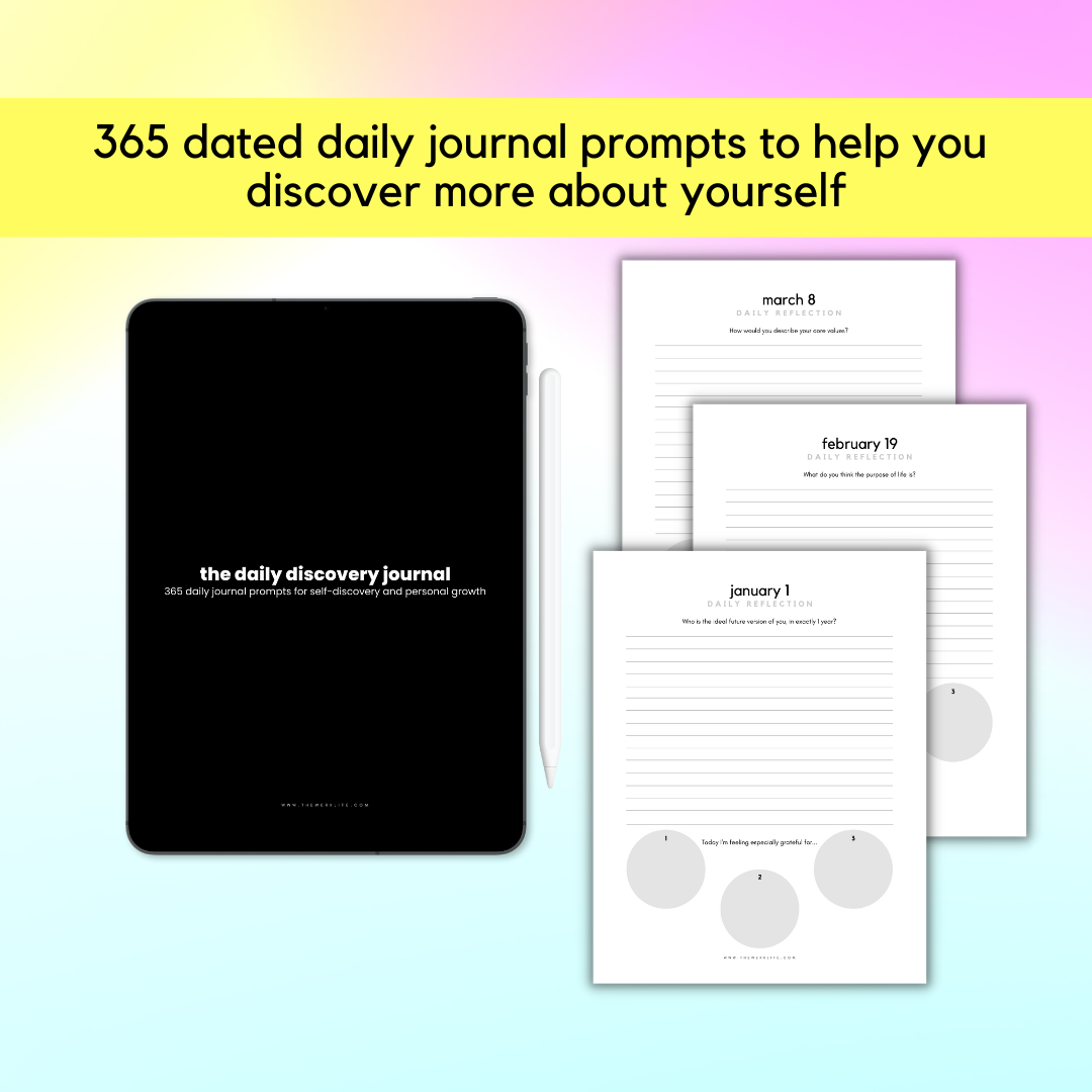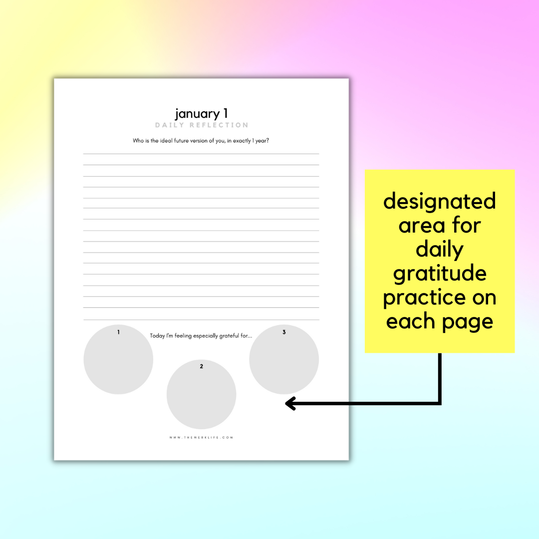 - 365 daily journal prompts with a gratitude section, dated from January 1 to December 31 [Please note that these are the same prompts from the 2022 Guided Journal - this digital journal is designed so that if you buy it once, you don't have to purchase it again!]