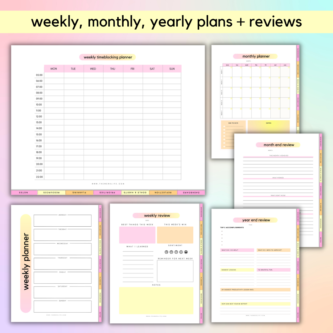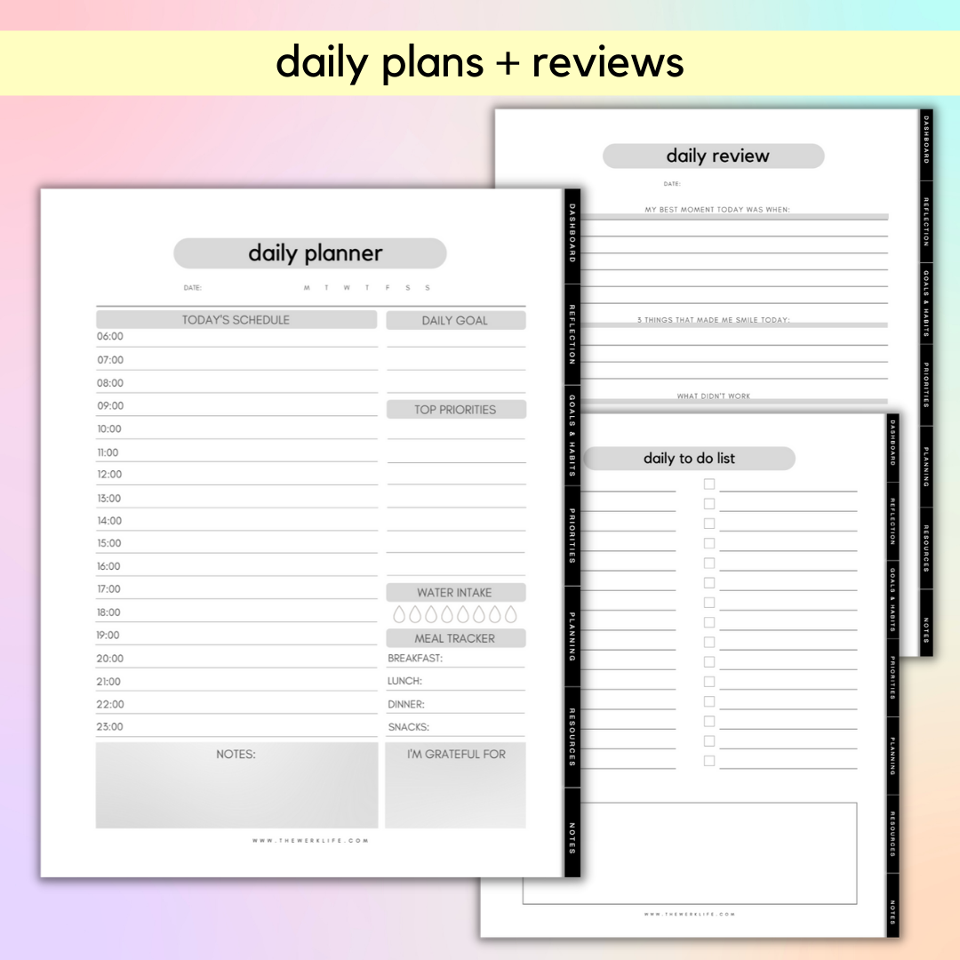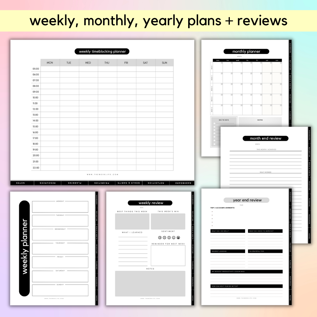 This digital planner has over 15 unique templates to help you self assess, set goals, follow routines, track habits, and plan efficiently. With daily, weekly, monthly, and yearly planning templates, this planner is just what you need to hit that optimal level of productivity. Whether it's completing a life audit or starting off fresh, this planner will help set you up for success.