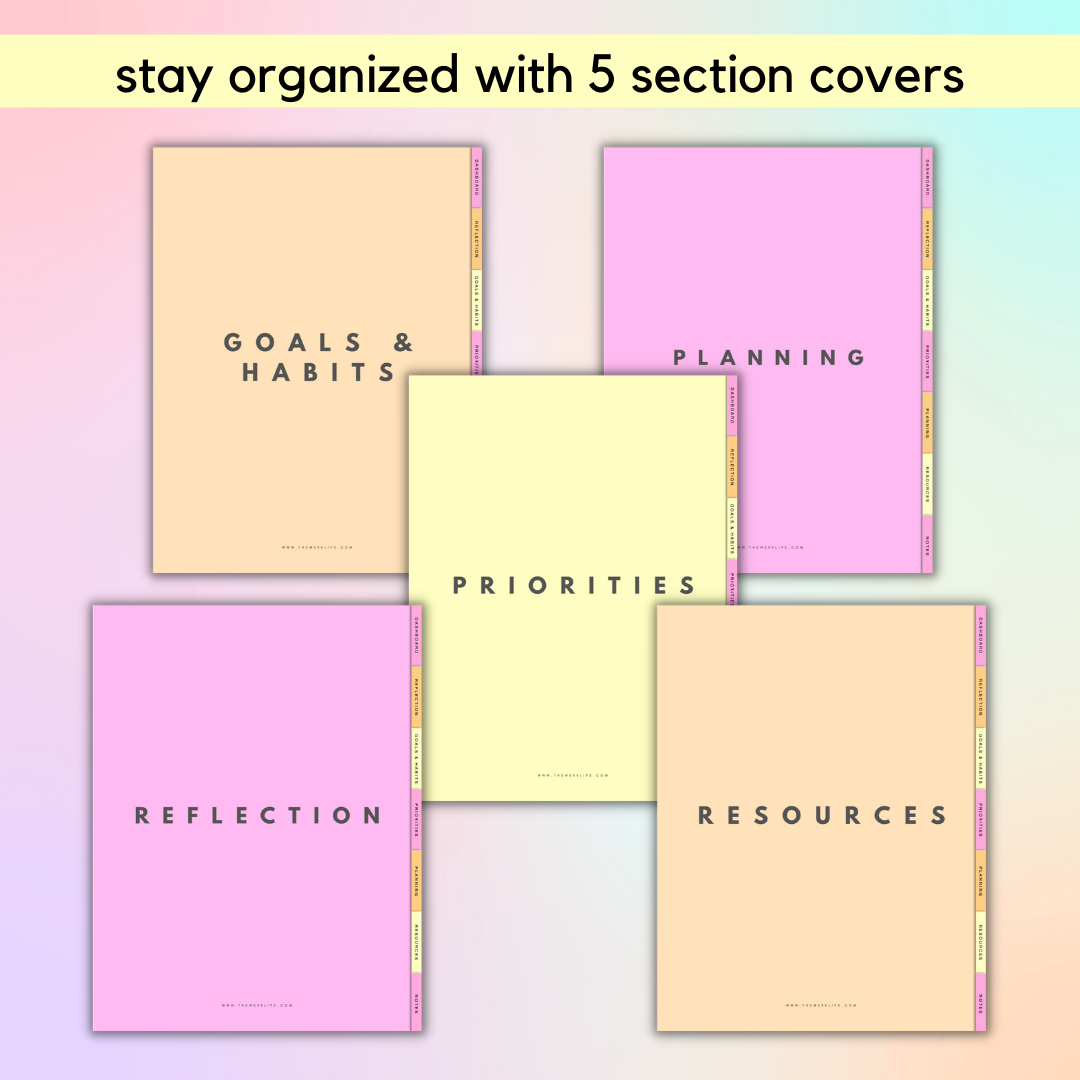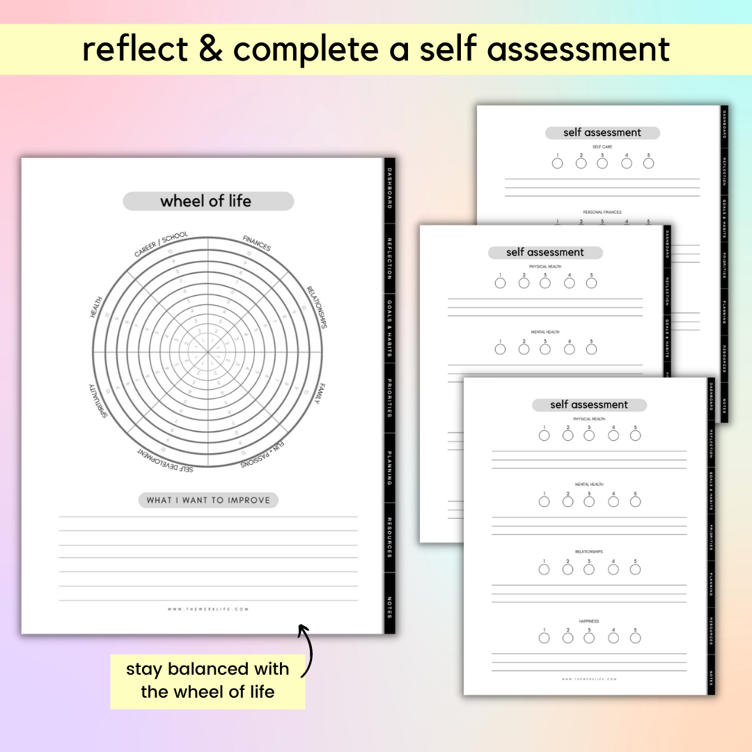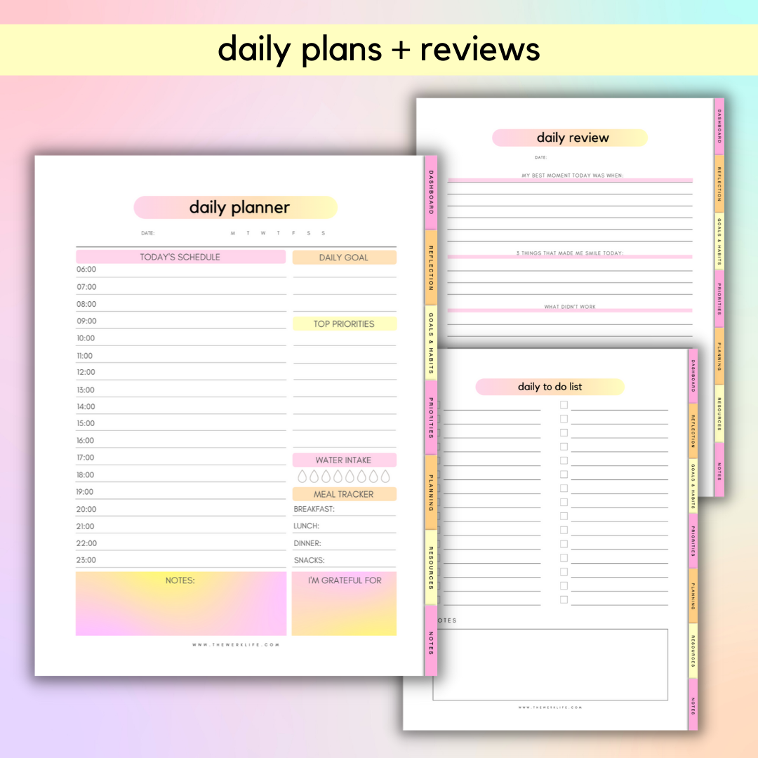 This digital planner has over 15 unique templates to help you self assess, set goals, follow routines, track habits, and plan efficiently. With daily, weekly, monthly, and yearly planning templates, this planner is just what you need to hit that optimal level of productivity. Whether it's completing a life audit or starting off fresh, this planner will help set you up for success.